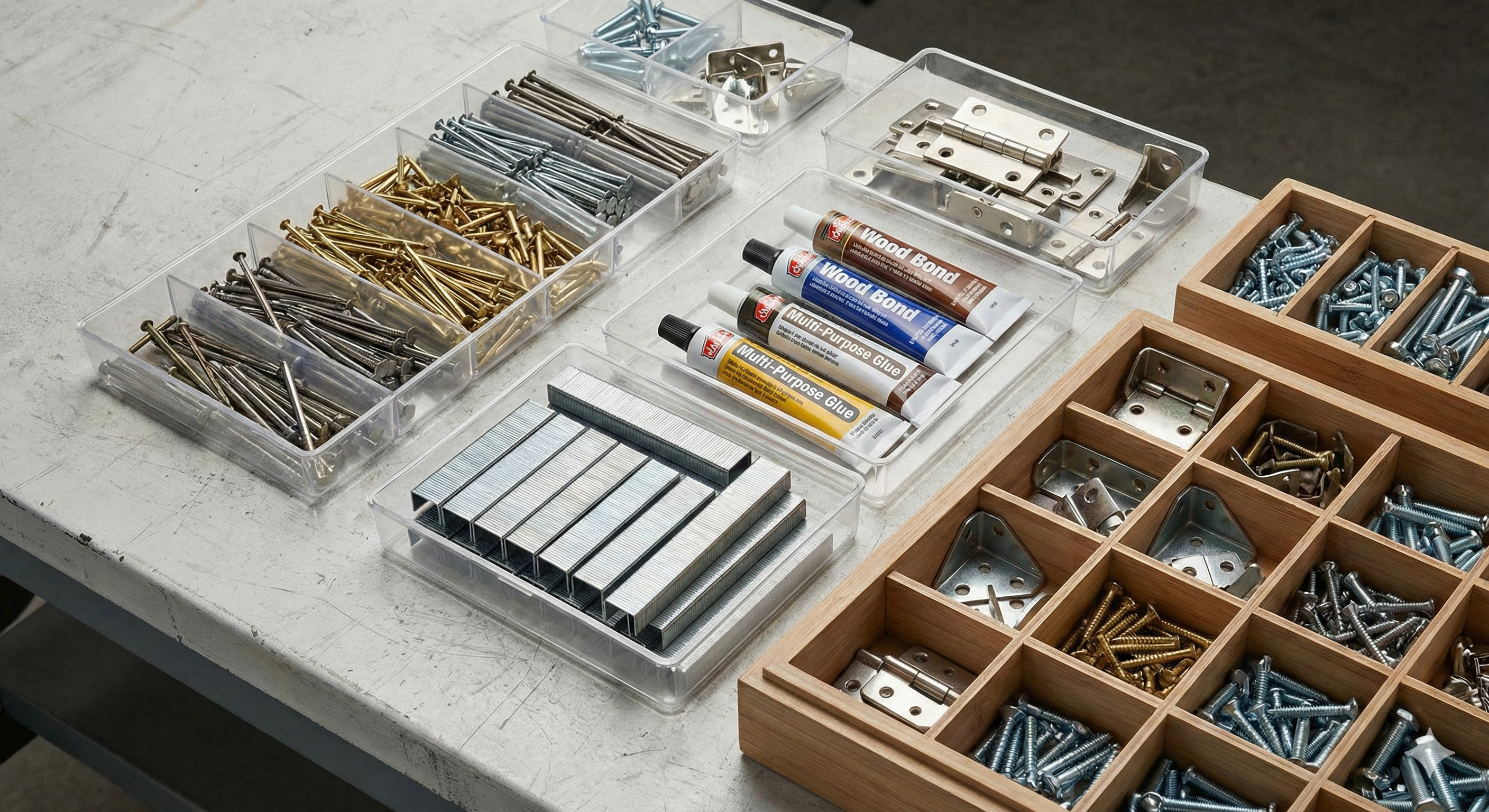 Adhesives, nails, staples, and fittings.